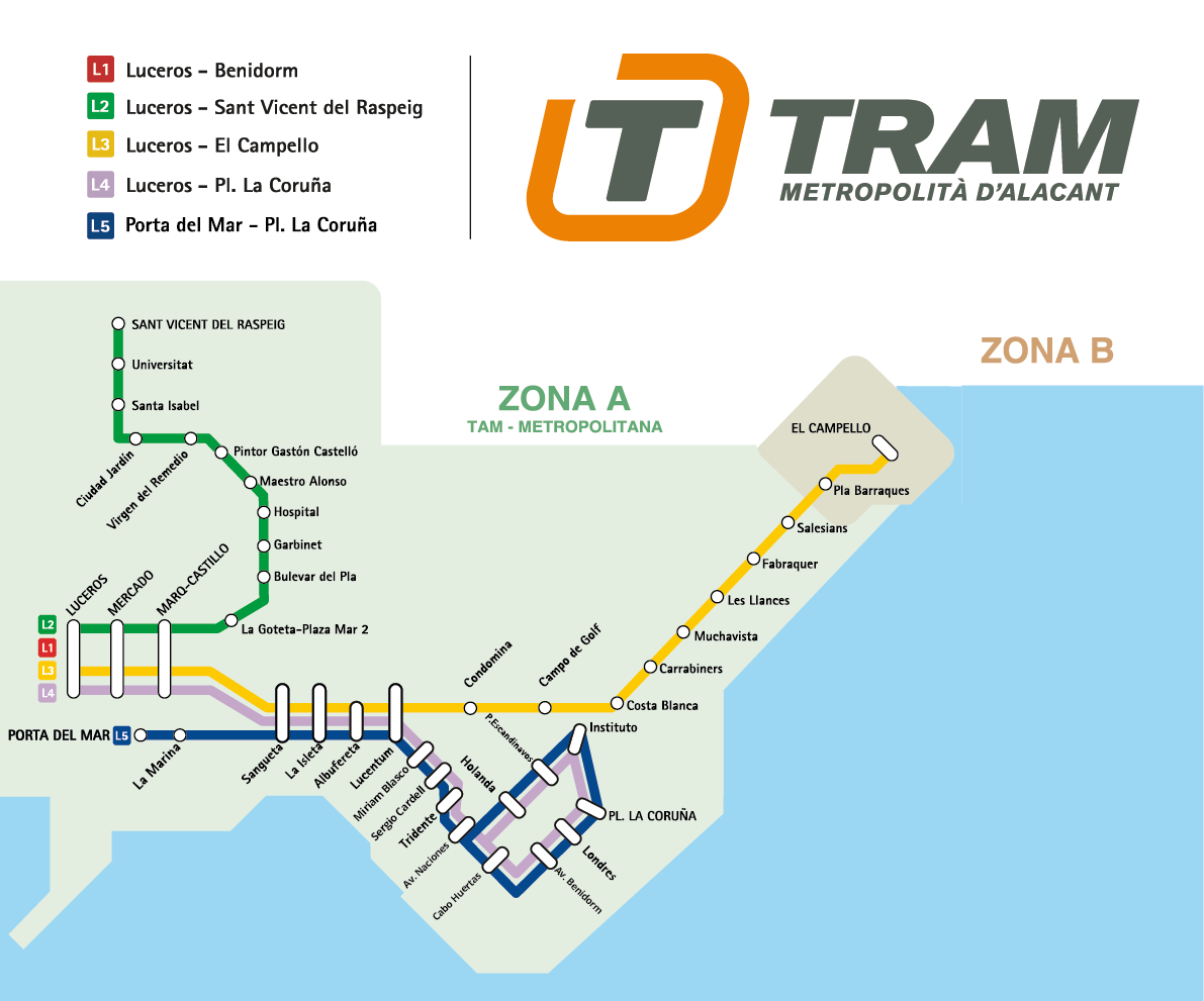 - Taking TRAM you can move comfortably from the center of Alicante (Plaza de Luceros) to Alicante University itself. A single ticket for one area (L2 is the one that takes you through Alicante) costs 1.35€/trip (2.30€ round trip). You can also buy the Alicante Tourist Card.